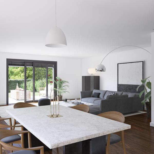 Rez-de-chaussée: Hall d’entrée avec penderie, toilettes visiteurs, accès à la cuisine entièrement équipée, séjour/salle à manger avec deux baies vitrées donnant accès à la terrasse et au jardin.